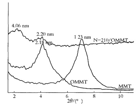 OMMT 的面尖銳的衍射峰表明蒙脫土片層的平均間距由原來的未改性的 MMT 的 1 1 23 nm 擴大到了 2 . 18 nm, 這是由于長烷基鏈結構的季銨鹽與 OMMT 發生了陽離子交換并插入到了 MMT 層間的結果。 N- 210 與蒙脫土的復合物的層間距達到 4 1 06 nm, 比有機蒙脫土的 2 . 18 nm 及蒙脫土的 1. 23 nm 都大 , 這是聚醚分子鏈通過攪拌的剪切作用插層進入蒙脫土片層間的結果。該圖可以說明 N - 210 已經插入到蒙脫土層間。用該法處理過的材料合成聚氨酯 , 反應過程中在反應熱以及機械攪拌力的作用下 , 有望使蒙脫土剝離而達到納米尺寸。