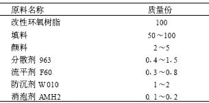 按表 3 提供配方用高速分散機混合攪拌均勻后 , 即得到乙組分。表 3 中胺類固化劑可為聚酰胺 651, 也可為異佛爾酮二胺等其他脂肪胺、脂環胺及其加成物 , 促進劑可為 DMP - 30 等。本涂料可制成無溶劑型 , 但根據工程施工情況和要求 , 本涂料也可加適量的混合溶劑如二甲苯丁醇等。