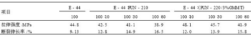 表 1 分別列出了由 N - 210 合成的聚氨酯預聚體 ( PUN - 210) 和通過 3%OMMT(100 份聚氨酯預聚體中加 3 份 MMT) 納米插層合成的聚氨酯預聚體 ( PUN - 210 /3%OMMT) 改性的環氧固化物的力學和斷裂伸長率性能測試結果。由表 1 可以看出 , 無論 PUN - 210 還是 PUN - 210 /3%OMMT 改性的環氧樹脂 , 都隨著預聚體聚氨酯含量的增加 , 改性環氧樹脂固結體的斷裂伸長率也隨之增加 , 柔韌性提高。但 PUN - 210 改性的環氧樹脂隨著聚氨酯含量的增加 , 柔韌性提高的同時 , 力學強度卻有所降低。而采用 PUN - 210 /3%OMMT 改性的環氧樹脂隨著聚氨酯用量的增加 , 斷裂伸長率增加 , 即柔韌性提高的同時 , 力學強度還在一定用量范圍內有所提高或穩定 , 在一定程度上可同時提高環氧樹脂的柔韌性和強度。采用蒙脫土納米改性聚氨酯來改性環氧樹脂 , 在一定程度上達到不以犧牲其力學強度為代價來提高環氧樹脂柔韌性的良好結果 , 這是目前國內外文獻所未曾報道的。對研制出一類既有高力學強度又有優良柔韌性能可應用于地坪涂料等領域的高性能環氧樹脂彈性復合材料具有重要的指導意義。
