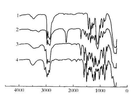 __ 比較曲線 1 和曲線 2 可以看出曲線 1 中 3 500 cm - 1 處的游離羥基伸縮振動峰在曲線 2 中大大減弱 , 且在 3 299 cm - 1 處出現仲酰胺的— NH 伸縮振動峰 , 曲線 2 中在 2 271 cm - 1 處出現較大的異氰酸根的 C — N 不對稱伸縮振動峰及 1 732 cm - 1 ( ν c = o ) 處出現較大的吸收峰 , 這說明聚醚中的羥基與 TD I 反應 , 生成了聚氨酯預聚體 , 在 1 538 cm - 1 處出現— NH 變形振動峰進一步證實了這一點。對比圖 2 中曲線 2 、曲線 3 和曲線 4, 可以看到曲線 2 中 2 271 cm - 1 處異氰酸根的 C — N 伸縮振動峰在曲線 3 中已經完全減弱 ; 在曲線 4 中 3 500 cm - 1 處的羥基的 O — H 伸縮振動峰在曲線 3 中減弱而在 3 300 cm - 1 處出現了仲酰胺的— NH 伸縮振動吸收峰以及在 1 731 cm - 1 處出現羰基的 C O 伸縮振動峰、 1 280 ~ 1 050 cm - 1 之間出現了較強的 C — O — C 對稱和不對稱伸縮振動 ( ν c 2 o 2 c ( as, s) ) , 這說明聚氨酯已經接枝到環氧樹脂上 , 符合預期的結果。