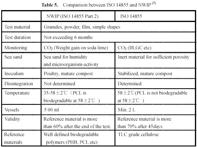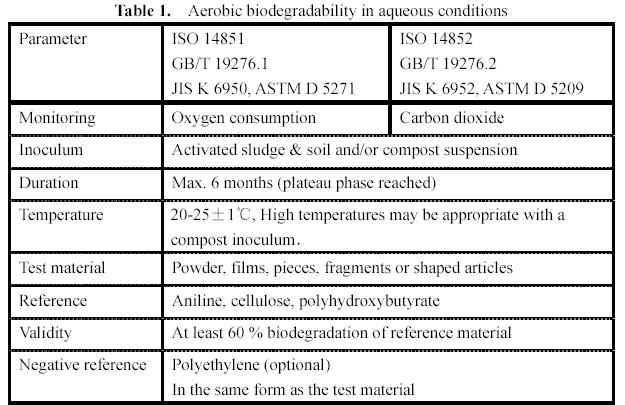 In 1992, Japan expressed its intension to propose a new working group on biodegradability in Beijing ISO meeting. A new working group (WG22) of the subcommittee (SC5) on biodegradability was created by the ISO technical committee on plastics (TC61) in 1993. Rapid advances have been made in this area since then. The following aerobic biodegradation test methods were developed and published. The general features are summarized in Table 1 and 2