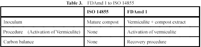 As indicated in Table 3, vermiculite and compost extract were used in place of mature compost as inoculum in the case of FDAmd1 to ISO 14855. Therefore, carbon balance was determined in this case. FDAmd 1 to ISO 14855 has been circulated to all national bodies for a 2 months voting.