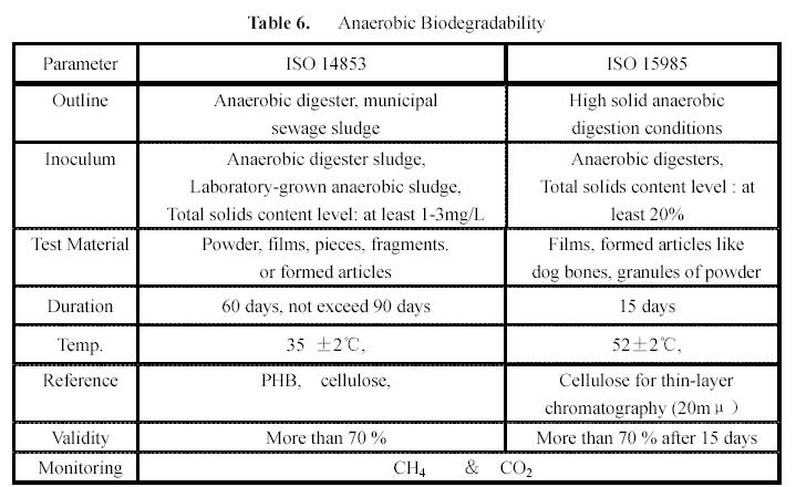 Two anaerobic test methods ISO 14853 (aqueous system) and 15986 (high solid content), which are shown in Table 6, will be published soon.