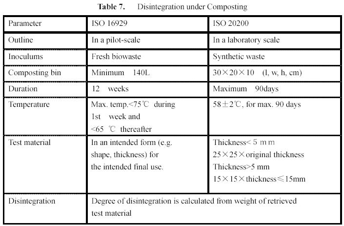 Two disintegration test methods (ISO 16929 and 20200) were published as indicated in Table 7. ISO 16929 is test method for determination of disintegration in a pilot scale. ISO 20200 is the test method for determination of disintegration in a laboratory scale.