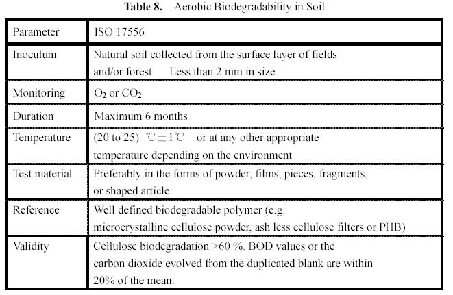 ISO 17556 is the test method for determination of aerobic biodegradability in soil (Table 8).