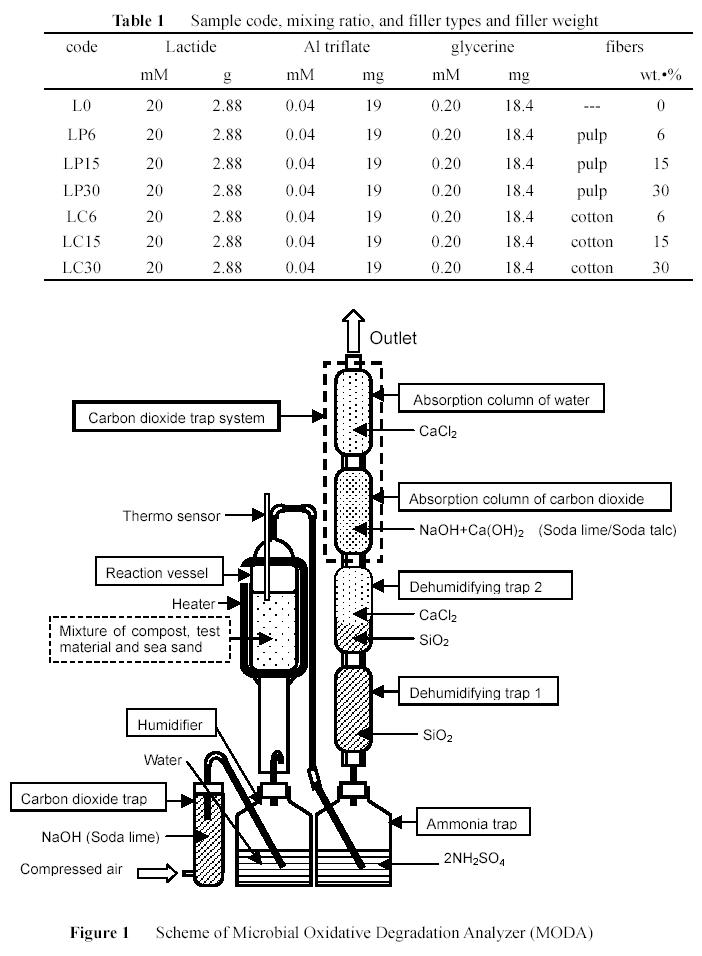 The biodegradability of samples was measured by two methods. One is the weight change of samples in the compost at 58 oC. Plate specimens (ca. 0.25 g) with about 12 mm diameter and 2 mm thickness were cut from the samples and put into plastic bottles (500 ml) with compost (80 g). The bottles were placed in an electric oven at 58 oC. The plate specimens were removed and washed in deionized water. The compost used in these experiments were mature compost made from used wood sponge for growing mushroom and chicken droppings under controlling condition. The weight of specimens was measured after removing water on the surface of the specimen by filter paper gently. The other method is gravimetric measurement of carbon dioxide of samples under controlled composting conditions by using MODA (Microbial Oxidative Degradation Analyzer, Hissan Trading Company Limited). The scheme of the MODA is shown in Figure 1. The samples (ca. 10 g) were cut and mixed with compost (ca. 80 g) and sea sand (ca. 320 g), and the mixture was put into a reaction vessel. The compost including sample in the reaction vessel was aerated air gas after trapping CO2 and controlling humidity as shown in the figure. CO2 gas in the evolved gas from the reaction vessel was trapped by upper two columns after dehumidifying lower two columns. The upper two columns of the absorption column of carbon dioxide and the abruption column of water were weighed everyday. In addition, the production amount of CO2 from the compost without sample was measured as blank in the same manner. The biodegradability was determined by dividing the difference between produced CO2 amount subtracting CO2 amount from the blank by theoretical produced CO2 amount for each sample. Once a week, the compost including sample was controlled the water content and mixed well after taking out from the reaction vessel.