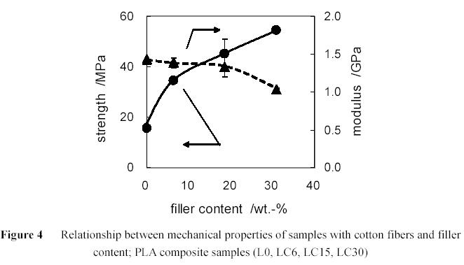 The mechanical properties of composite samples are shown in Figure 4. For PLA/CFC composite samples, two relationships between fiber content and strength and between fiber content and modulus are shown in Figure 4. The values of modulus decrease with increasing filler content. It is difficult for the manufacturing method in this study to remove air in the composites. The existence of air in composites also causes the decrease of modulus of samples. In contrast, the values of strength for both composite samples increase with increasing filler content. The fillers in composites prevent the breakage of samples, although PLA is brittle matrix. The almost same results for PLA/CFP composites as those for PLA/CFC samples were obtained. The modulus of composite samples is mainly determined by the modulus of PLA and a small decrease of modulus seems to be caused by a decrease of molecular weight of PLA in composites.