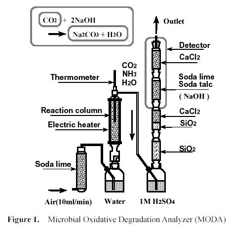 摘要:塑料是一種已被社會(huì)所接受的用于取代鋼鐵的材料。但是,本世紀(jì)以來塑料所造成的環(huán)境污染逐漸開始引起人們的重視,而關(guān)于塑料及其用品的報(bào)廢回收已發(fā)展成為一門學(xué)科。這一問題促使了可被微生物分解的生物降解塑料的出現(xiàn)??缮锝到馑芰峡杀环纸鉃樗投趸?。而且,由于生物降解塑料的燃燒熱和所產(chǎn)生的二氧化碳量比普通塑料有所降低,消耗對(duì)環(huán)境所造成的負(fù)擔(dān)也較小。因此可生物降解塑料被看做是一種環(huán)境友好塑料??缮锝到馑芰弦驯粡V泛應(yīng)用于農(nóng)業(yè)、林業(yè)、漁業(yè)、建筑業(yè)、器具、食品包裝、衛(wèi)生設(shè)備、辦公用品以及環(huán)保汽車中。為了開發(fā)可生物降解塑料,需要建立一種可以與普通塑料相比較的關(guān)于塑料生物降解性的測試方法??缮锝到庑詼y試與物理性能測試不同,而且評(píng)測值取決于微生物的種類。目前,各國的測試方法未能統(tǒng)一。1999年ISO提出了ISO14855作為生物降解性的測試標(biāo)準(zhǔn)。ISO14855是一種評(píng)估在極限需氧氧化的堆肥過程中的生物降解性的方法。在ISO14855成為法定標(biāo)準(zhǔn)后,更高品質(zhì)的可生物降解塑料出現(xiàn)了。ISO14855的測試需要大量的試樣,而且所需設(shè)備也很大型。本文所提出的MODA方法所需的有機(jī)材料只有ISO14855所定義的十分之一。將物料與海沙混合,保持濕度在25-35%范圍之間。分解所產(chǎn)生的二氧化碳用裝在檢測塔中堿石灰吸收,并對(duì)檢測塔定期進(jìn)行重量分析,精度±10mg,如圖中所示。