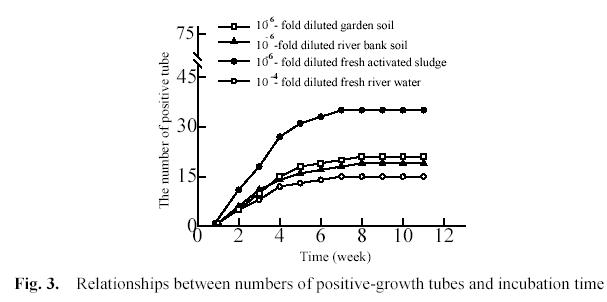 Fig. 3 shows that the relationships between the numbers of positive-growth tubes and incubation time. 1 ml of 10-4-fold diluted river water and 10-6-fold diluted garden soil, river bank soil and activated sludge were inoculated into each of three groups of tubes. Every group included 75 tubes. In every tube there were 5 ml of growth medium and a piece of PHB/V film, and the tubes were incubated at 28 0C in the dark under