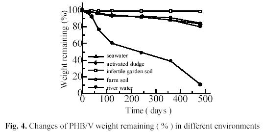 Fig. 4 also shows that the degradability of PHB/V in aquatic ecosystems is considerably higher than in soil ecosystem. One of the possible reasons is that degradation process of PHB/V is hydrolytic reaction of polyester under catalysis of PHA-depolymerase secreted by degraders on the polymer. Since PHA-depolymerase secreted by degraders were water-soluble, the enzymic degradation was more easily to