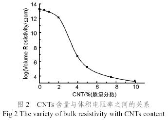 圖2 為CNTs含量與復合材料體積電阻率之間的關系(室溫)。從圖2曲線可以看出,隨著碳納米管的加入,開始時復合材料的體積電阻率僅略有下降。當碳納米管含量達到一定的值時,復合材料的電阻率迅速降低。但是繼續增大碳納米管在復合材料中的含量,復合材料的電阻率又變化緩慢。這是因為碳納米管之間的間距大,當碳納米管含量較低時很難形成完整的導電通道。但由于碳納米管的納米尺寸以及其極高的長徑比,隧道導電效應顯著。因此,復合材料的電阻率隨碳納米管的加入下降緩慢。當碳納米管含量增至某一臨界值(滲濾閾值)(Percolation threshold)時,碳納米管相互纏繞連接,形成完整的導電通道,體積電阻率急劇降低。所以在電阻率-碳納米管含量的曲線上出現一個突變區,在此區域內,導電填料含量的變化將導致電阻率的顯著改變。其后,大量的碳納米管相互接觸形成導電通路,電阻率隨碳納米管含量的變化又趨于平緩。