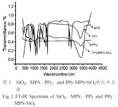 SiO2、MPS、PPy和PPy/ MPS-SiO2的IR譜圖參見圖1。由圖可知,SiO2的特征吸收峰(1100cm-1)、硅烷偶聯劑MPS的特征吸收峰(2946、2846、1720、1638、1455、1167、1088 cm-1)和PPy的特征吸收峰(1540、1460、1300、1150 和890 cm-1)在PPy/ MPS-SiO2的IR譜圖中都有體現。盡管官能團的分子環境差異使峰位有所偏離,但足以證明復合體系中的PPy、SiO2和MPS的存在。