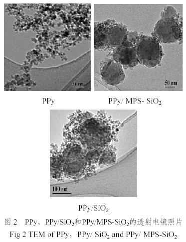 圖2 分別為PPy、PPy/ SiO2、PPy/ MPS-SiO2的TEM照片。由圖可見,用偶聯劑MPS處理SiO2粒子,隨后進行吡咯的聚合,得到的粒子外表為富含聚吡咯的PPy/ SiO2復合材料,外型似“木莓形貌”(raspberrymorphology),此種形貌曾被Armes、Gill[3,4]等小組報道過。與未用偶聯劑處理的SiO2制備的PPy/ SiO2復合材料相比,PPy/ MPS-SiO2復合材料中SiO2粒子表面被PPy包覆的更完全。這是由于未處理SiO2時,吡咯基本是在SiO2孔隙中聚合,所得的材料表面富有SiO2;而經MPS處理后,MPS發生醇解生成硅醇基,與SiO2表面的羥基發生化學鍵合將SiO2包覆,而MPS的羰基與吡咯環上的仲胺基可形成氫鍵使得材料表面富有PPy,因此表現出較高的電導率。