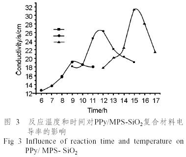 圖3 為不同反應溫度和時間與PPy/MPS-SiO2復合材料電導率的關系曲線。由圖可看出,溫度越低反應速度越慢,聚合時體系顏色變化比較緩慢,材料電導率呈現上升的趨勢;電導率隨反應時間呈先上升后下降的趨勢。原因可能是吡咯聚合系逐步聚合,低溫下聚合反應速度低反應時間較長,能進行較好的聚合和摻雜,形成的聚合物鏈缺陷少,鏈段長,結構規整度好,所以電導率較高。但反應時間過長,可能會有一些副反應發生及吡咯環局部過氧化,導致電導率下降[5]。據此我們作了0℃(15h)、20℃(12h)、40℃(9h)材料的元素分析,結果如表1。