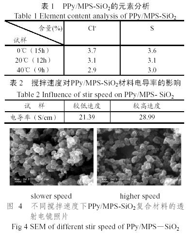 (3)攪拌速度對聚吡咯復合材料的電導率亦有明顯的影響,較高速度下合成的材料粒徑較小,且分散規整均勻,宏觀表現為材料電導率較高。