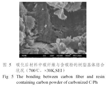 碳/酚醛材料經(jīng)過700℃碳化后,微觀結(jié)構(gòu)見圖2,由圖2可知,不含碳粉組的材料雖沒有出現(xiàn)明顯的布層與基體之間界面層分層,但是微米級的裂紋明顯多于含碳粉組材料的裂紋,截?cái)嗝嬗写罅棵撀錁渲w碳碎片,且碳纖維束中的碳纖維之間脫粘嚴(yán)重、纖維之間松散,形成了單根纖維,材料承載能力和抗沖刷能力下降。含碳粉組材料的布層與基體之間雖出現(xiàn)局部脫粘,但是截?cái)嗝嫫秸w維之間結(jié)合相對緊密,同時(shí)可看出纖維束內(nèi)部的纖維與基體之間的裂縫明顯小于纖維束與層間基體之間的裂縫,有利于提高材料的界面性能。
