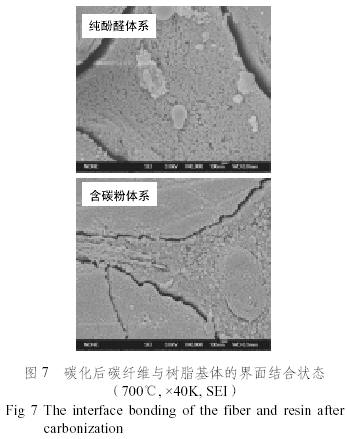 在2000倍下,纖維與纖維之間存在大量的含碳粉的樹脂基體,基體與碳纖維結(jié)合良好;在10000倍下(圖3),碳纖維表面存有大量的納米碳粉(含樹脂)的顆粒。圖4為碳化后的單根碳纖維表面狀態(tài),由圖4可知,樹脂基體脫落后,碳纖維表面殘存了大量的納米碳粉粒子。圖5為700℃碳化后纖維與樹脂基體的結(jié)合狀態(tài),可見樹脂基體與碳纖維之間間隙非常小。進(jìn)一步對碳化后材料中碳纖維表面進(jìn)行分析,結(jié)果見圖6,從圖6可發(fā)現(xiàn),大量不同粒徑的納米碳粉粒子與樹脂基體滲入碳纖維表面的溝槽中,增大了碳纖維表面積,提高表面活性,同時(shí)可看出纖維表面存在明顯的樹脂剪切拉伸斷裂帶。圖7為700℃碳化纖維與基體的界面結(jié)合狀態(tài),從圖7 可看出,不含碳粉體系的纖維與樹脂之間在碳化后的界面間隙一般達(dá)到200nm以上,而含碳粉體系纖維與樹脂之間在碳化后的界面間隙一般比較低,在100nm以下,同時(shí)由于碳化中界面的作用力,碳纖維出現(xiàn)開裂情況,纖維與樹脂的斷裂面出現(xiàn)不規(guī)則的形狀,樹脂突起部分與纖維表面的溝槽相一致,形成了鑲嵌結(jié)構(gòu),而純樹脂體系的界面斷裂面光滑。這一結(jié)果表明,納米碳粉對碳纖維有很好的親和性,纖維與基體的界面所存在的大量納米粉體粒子對材料層間性能與纖維方向壓縮強(qiáng)度的提高能起到有利的作用。