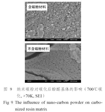 對納米碳粉與酚醛樹脂之間結(jié)合狀態(tài)進(jìn)行了分析,圖8為酚醛樹脂基體與碳粉的結(jié)合狀態(tài);圖9為碳粉對碳化后酚醛樹脂基體的影響。由圖8可發(fā)現(xiàn),納米碳粉與樹脂基體結(jié)合緊密;由圖9可知,含碳粉材料碳化后內(nèi)部氣孔相對較大且較多,形成了大量的納米級的球形空洞,納米碳粉粒子約束了樹脂基體的碳化收縮,樹脂基體開裂情況比較少。而不含碳粉體系的基體內(nèi)部也有碳化后的氣孔,但是數(shù)量比較少,同時(shí)可看出氣孔呈現(xiàn)不規(guī)則的扁孔形狀,這可能是樹脂碳化收縮產(chǎn)生應(yīng)力而變形所致。
