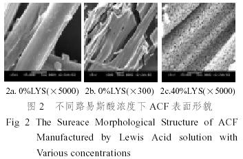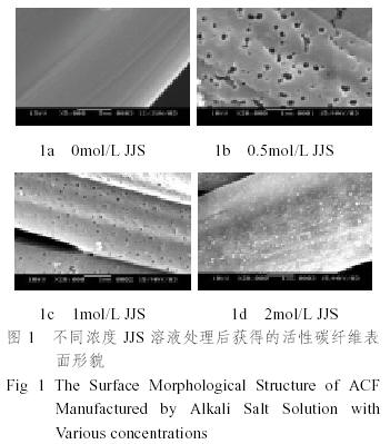 當濃度進一步增大到2mol/L時,ACF表面稠密分布的不是孔洞,而是白色粒狀物質,我們推測可能是析出的堿金屬鹽的結晶體。可以認為這種具有較高熔點和分解溫度的鹽類,其金屬離子在一定溫度條件下能進入到纖維內部,并作為電介質使纖維素分子橫向漲潤,空隙增大。在低溫預處理階段由于水份的去除又容易重新以鹽的結晶體形式析出。活化階段晶體鹽在一定高溫條件下會從纖維中逸出,就可能形成表面相同尺寸的孔洞。這樣,通過控制金屬鹽溶液的濃度和低溫預處理的溫度等條件就可以通過控制鹽結晶體的尺寸來控制最終形成的孔的尺寸,達到活性碳纖維表面孔的可控制備。