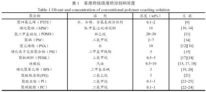 沉淀法主要是溶劑蒸發沉淀相轉化法,將聚合物溶液刮涂于多孔的或無孔的無機支撐物上,使溶劑蒸發,得到了均勻致密的聚合物膜皮層[2]。根據需要,可以反復進行以上過程。除了刮涂外,還可以根據無機支撐膜是管式的還是板式而采取浸涂、噴涂或旋轉涂敷。此復合膜有機相與無機相之間主要為物理相互作用,聚合物膜厚范圍為0.1~50µm。無機支撐膜為陶瓷或玻璃膜。除了溶劑蒸發沉淀相轉化法外,也有人利用浸沒沉淀相轉化法制備了致密的聚偏氟乙烯/陶瓷復合膜[13]。以上復合膜主要用于氣體分離、全蒸發和反滲透,也有人用于了微濾[9]和超濾[10, 14]。溶劑蒸發沉淀制備復合膜應注意以下幾個問題。首先要注意孔滲現象。由于采用多孔無機膜做支撐體,毛細管力的作用使在涂膜過程中發生孔滲,使無機支撐膜的傳質阻力增大。可以用不同的方法來避免或減少孔滲現象。最通用的方法是將無機膜孔預先填入某種物質,再涂膜,待有機膜形成之后,除去孔中的物質。如Matsumoto制備磺化聚砜/陶瓷復合膜時使用的填孔物質是殼聚糖,利用的殼聚糖在pH值小于6時可溶的、pH值大于6時變成懸浮液的性質[7]。另一種方法是采用高分子量聚合物并選用良溶劑,因為二者可使膜液中線團的流體力學半徑增大。表1中列出了一些常用聚合物的溶劑和濃度。影響孔滲的另一個重要因素是無機膜的孔徑分布,孔徑分布應當越窄越好,此外表面孔隙率應盡可能高,一般情況下,空隙率為50%。