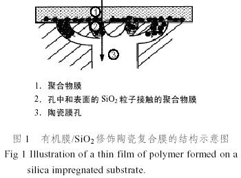 改性之后再進行有機膜的涂層[24, 25]。圖1是改性無機上涂層有機膜形成的復合膜的結構示意圖。第二種方法是熱分解法,分解法是制備多孔SiO2、碳分子篩膜等的常用方法。一般是將硅橡膠涂敷在無機支撐體上,一定溫度下熱解,去除有機成分,涂層硅橡膠就形成以碳-碳、硅-氧等主鏈為骨架的無機網狀孔結構。這種改性方法適用于空隙率很高或聚合物是玻璃態的情況。對聚酰亞胺溶液浸涂在兩種方法修飾的無機膜上所制備的復合膜,進行了氣體滲透實驗,結果發現熱分解法處理的復合膜的滲透率比用溶膠SiO2處理的要低50%。可以說,溶膠-凝膠比熱分解法更有發展前途[23]。