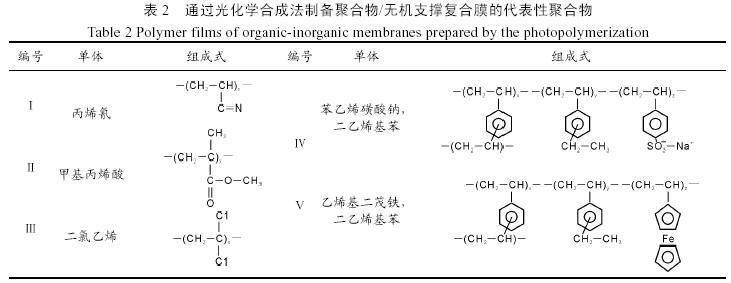 這兩種方法都是在微孔無機膜上復合上一層超薄聚合物膜。Liu用電化學方法研究二乙烯基(DVB)和乙基乙烯基苯(EVB)在陶瓷膜表面的聚合反應[31],這兩種單體在電解質溶液中經電化學還原成陰離子,然后通過陰離子聚合反應機理在修飾的陶瓷膜表面聚合生成DVB- EVB共聚物。用此膜進行氣體傳輸實驗、計時電流、計時電壓實驗,結果都證實所制得的復合膜為具有選擇性的無缺陷膜。在光化學合成法中單體進行的是自由基聚合,因此通過這種方法制備復合膜的有機單體很多。表2中列舉了一些通過光化學合成法在無機支撐膜上制備的膜的組成以及它們的單體。用表2中Ⅴ號乙烯基二茂鐵-二乙烯基苯共聚物/Al2O3陶瓷膜進行氣體滲透實驗,O2/N2的分離系數是8.0,膜厚為40~3200 nm[32]。