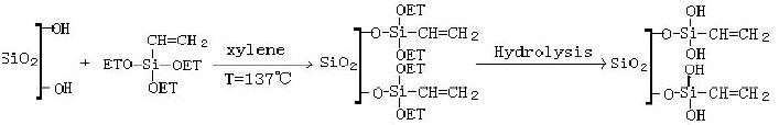Castro在修飾的多孔SiO2膜表面進行了1-乙烯基2-吡咯烷酮(VP)接枝聚合,制備了聚乙烯吡咯烷酮(PVP)/SiO2復合膜[35]。選擇的改性劑是乙烯基三乙氧基硅烷(VTMS,CH2=CHSi(OCH2CH3)3),在二甲苯中它與SiO2膜表面的-OH發生水解反應,生成了表面帶有乙烯基活性點的SiO2膜,SiO2膜表面修飾的過程如下式: