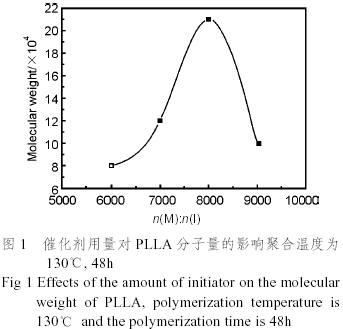 (1)采用辛酸亞錫為引發(fā)劑,通過對引發(fā)劑用量和聚合時間的控制,合成出粘均分子量為21×104的高分子量聚L-乳酸。