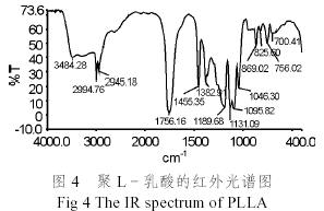 圖4為聚乳酸的紅外光譜圖。從圖4中可以看出,在1756cm-1的吸收峰屬C=O的伸展振動,1189 cm-1峰和1131 cm-1屬C-O伸展振動,證明存在酯基團,2900 ~3000 cm-1之間的峰當(dāng)屬C-H的伸展振動,1455 cm-1峰屬C-H的變形振動,1382 cm-1峰屬甲基的特征峰,證實了聚乳酸的結(jié)構(gòu)。