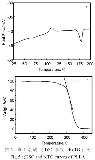 圖5a)和b)分別示出了聚乳酸的DSC曲線和TG曲線。由DSC分析可知,聚乳酸的玻璃化轉(zhuǎn)變溫度為62℃,結(jié)晶熔融熱為39.42J/g,從結(jié)晶熔融熱計算試樣的結(jié)晶度(Xc%)為42.3%,完全結(jié)晶的PLLA的結(jié)晶熔融熱取93.1J/g[10]。從聚乳酸的熱重分析譜可以看出,聚乳酸的熱分解溫度為299℃。