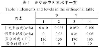 本實(shí)驗(yàn)采用丙交酯開環(huán)聚合合成不同相對(duì)分子質(zhì)量的聚乳酸。影響聚乳酸相對(duì)分子質(zhì)量的因素很多,主要有單體丙交酯的純度、引發(fā)劑種類及濃度、真空度、聚合溫度、聚合時(shí)間、相對(duì)分子質(zhì)量調(diào)節(jié)劑及濃度等。本實(shí)驗(yàn)采用自制高純丙交酯(重結(jié)晶四次,熔點(diǎn)為126~127℃),辛酸亞錫作引發(fā)劑,月桂醇作調(diào)節(jié)劑實(shí)施本體開環(huán)聚合。有文獻(xiàn)報(bào)道真空度對(duì)相對(duì)分子質(zhì)量有著重要的影響,但本實(shí)驗(yàn)采用高真空系統(tǒng)裝置,真空度可以達(dá)到10-4Pa,真空度可在較寬范圍內(nèi)調(diào)節(jié)。根據(jù)正交實(shí)驗(yàn)原理,我們選擇引發(fā)劑濃度、調(diào)節(jié)劑濃度、聚合溫度、聚合時(shí)間四個(gè)代表因素,設(shè)計(jì)了一個(gè)四因素四水平的正交實(shí)驗(yàn)表L16(44)。以探求得到較高分子量聚合物的最優(yōu)反應(yīng)條件,目的在于為后面制備較小分子量產(chǎn)物提供參考,正交表見表1。