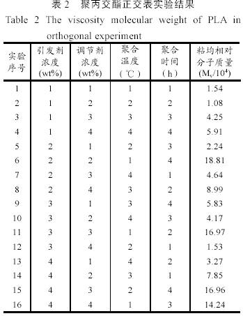 按照表1設(shè)計(jì)實(shí)驗(yàn)所得實(shí)驗(yàn)結(jié)果見表2。實(shí)驗(yàn)結(jié)果顯示:可以制備粘均相對(duì)分子質(zhì)量1,000~200,00Da較寬范圍的聚丙交酯。當(dāng)引發(fā)劑辛酸亞錫濃度為0.1%(質(zhì)量分?jǐn)?shù)),月桂醇0.04%(質(zhì)量分?jǐn)?shù)),聚合溫度為130℃,聚合時(shí)間為10h為最佳聚合條件,這時(shí)聚乳酸的相對(duì)分子質(zhì)量會(huì)較高。
