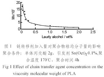 從圖1可以看到:月桂醇的添加量在0.5%以內(nèi)時(shí),對(duì)分子量的影響較大,在此區(qū)間曲線較為陡峭。Schuatch等[6]指出辛酸亞錫引發(fā)LA的開環(huán)聚合是按辛酸參與共引發(fā)的陽離子機(jī)制進(jìn)行的。但Kricheldorf等[7]則認(rèn)為是配位插入機(jī)理(或者稱之為復(fù)合機(jī)理或二級(jí)插入機(jī)理更合適[8,9]),即錫鹽首先進(jìn)攻單體,烷氧基斷裂形成活性中間體并在Sn—O鍵上進(jìn)行插入增長,他們認(rèn)為辛酸亞錫只是催化劑,真正的引發(fā)劑是體系內(nèi)的痕量羥基化合物(如H2O,ROH等)[10]。我們傾向于配位插入機(jī)理,聚合體系的活性中心向月桂醇鏈轉(zhuǎn)移,反應(yīng)體系內(nèi)含羥基雜質(zhì)能計(jì)量地控制聚合物的分子量(降低分子量,并使分子量分布變寬),鏈轉(zhuǎn)移反應(yīng)對(duì)平均聚合度影響的定量關(guān)系如下: