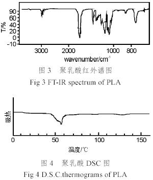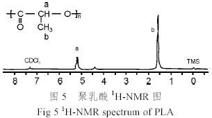 我們對(duì)得到的聚乳酸產(chǎn)物作了紅外、核磁、示差熱量掃描等分析表征,結(jié)果分別如圖3、圖4、圖5所示。圖3是聚乳酸的紅外光譜圖,譜圖中最強(qiáng)峰是1756cm-1附近的C=O伸縮振動(dòng)峰,次強(qiáng)峰為1092cm-1的C―C伸縮振動(dòng)和1188cm-1附近的C―O伸縮振動(dòng)峰,2995cm-1是CH3伸展振動(dòng)峰,2945cm-1是CH伸展振動(dòng)峰,證明―CO―O基的存在,所得聚合物為聚酯,930 cm-1處無吸收峰,證明丙交酯環(huán)狀結(jié)構(gòu)消失,轉(zhuǎn)化率很高。圖4是聚乳酸的DSC曲線,由曲線可以看出所得聚乳酸只有玻璃化轉(zhuǎn)變溫度Tg=58.9℃,不存在熔點(diǎn)Tm,這表明所制備的聚合物為無定形的聚D, L-乳酸。圖5為聚乳酸的核磁共振譜圖,在δ1.6ppm處為CH3峰,δ5.2 ppm處為CH峰,較單體丙交酯化學(xué)位稍移向左移動(dòng)一點(diǎn),裂分峰數(shù)變多,可能是所處化學(xué)環(huán)境變得復(fù)雜所致。
