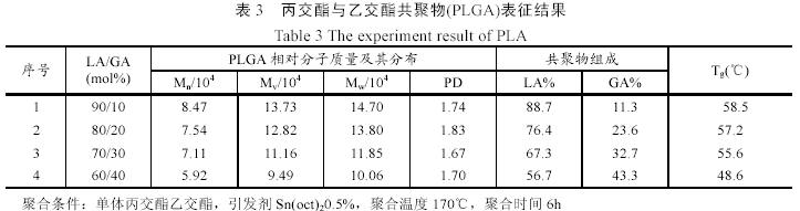 為改善聚乳酸均聚物的性能,本實(shí)驗(yàn)制得了丙交酯與乙交酯不同配比的共聚物(PLGA)。制備的方法是先將乳酸和乙醇酸單體制成環(huán)狀化合物丙交酯和乙交酯,再開環(huán)聚合得到不同單體配比的PLGA,結(jié)果列入表3中。