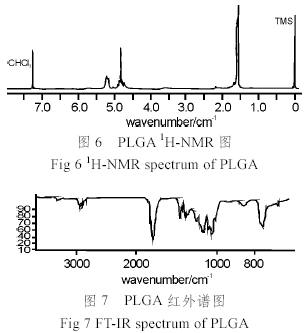 用GPC測(cè)試PLGA相對(duì)分子質(zhì)量及其分布,從表中可以看出隨著GA的增加,PLGA相對(duì)分子質(zhì)量降低,但其分布幾乎不變。從PLGA的1H-NMR譜圖可以定量地求出共聚物的組成,共聚物中GA單元的含量高于單體配比中GA的含量,緣于GA的竟聚率高于LA的竟聚率。文獻(xiàn)[1]報(bào)道在200℃時(shí),GA的竟聚率r=2.8,LA的竟聚率r=0.2,因共聚時(shí)轉(zhuǎn)化率很高,所以共聚物中GA的含量僅僅略高于單體中GA的含量。從所得PLGA的DSC曲線來看,同PLA一樣,只有玻璃化溫度Tg,不存在熔點(diǎn)Tm。隨著共聚物中GA單元含量的增加,大分子鏈柔韌性增加,從而使玻璃化溫度下降。PLGA的IR譜圖如圖7,在3000~2880cm-1有C-H伸縮振動(dòng)峰,峰形隨組成而變化,可能是不同比例的聚合物的C-H化學(xué)環(huán)境不同的緣故;1760cm-1是C=O伸縮振動(dòng)峰,在1423cm-1處有CH2的彎曲振動(dòng)吸收峰,此峰在PLA中沒有觀察到,證明PLA中無亞甲基,共聚物中含有GA。