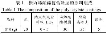 納米TiO2,含量≥98%,銳鈦礦型(A-TiO2),平均粒徑20nm,金紅石型(R-TiO2),平均粒徑30nm,江蘇常泰納米材料有限公司;顏料級銳鈦礦型TiO2,日本石原產業株式會社,型號為A-100,平均粒度為0.18μm;顏料級金紅石型TiO2,日本石原產業株式會社,型號為R-930型,平均粒度為0.25μm,硫酸法生產;丙烯酸酯樹脂,美國Rohm & Haas公司,AC-261,固含量(50±0.5)%,pH=9;煅燒高嶺土,平均粒徑10μm,北京國立超細粉體有限公司。