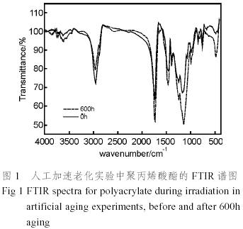 (1)丙烯酸酯聚合物在紫外光的照射下發生降解,C-H鍵受到破壞斷裂,聚合物的氧化產物C=O、C-O以及OH的含量增加。金紅石和銳鈦礦型納米TiO2也對紫外線有較強烈的吸收和散射作用,紫外光透過率低。