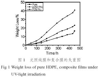 圖1是純膜和含TiO2 1%的復(fù)合膜在1mW/cm2(相當于武漢冬天太陽光光強)光強下的失重曲線。由圖可知,復(fù)合膜的失重率遠遠大于純膜的。在紫外燈下連續(xù)光照約450h后,純膜降解率為16.5%,TiO2含量為0.5%和1%的復(fù)合膜降解率是分別是23.1%和40.7%,光照780h后,純膜的失重率為21.2%,二氧化鈦含量為1%的復(fù)合膜失重達到了58.1%,很明顯TiO2對聚乙烯膜的降解起了催化作用。