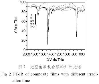 圖2是復(fù)合膜的紅外光譜圖。圖中1714cm-1處新峰為羰基吸收峰,而且隨著時間的增加,羰基峰的強度也隨之增加。純膜由于在制造過程中引入了氧及雜質(zhì),因此在其光照過程中也伴隨有羰基產(chǎn)生和降解現(xiàn)象,但是其降解速率要小于復(fù)合膜。此結(jié)果表明,TiO2在紫外光的作用下形成的·OH 和·O2-等自由基加快了聚乙烯鏈的斷裂并使其氧化成羰基,因此加速了聚乙烯膜的光氧化進程。