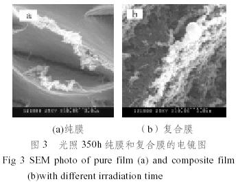 圖3為紫外光(1mW/cm2)照射350h的純膜和含TiO21%復(fù)合膜的表面形貌圖。復(fù)合膜(b)在光照350h后表面結(jié)構(gòu)被嚴重破壞,表面有很大的裂紋,并出現(xiàn)了粉化現(xiàn)象,并且有大量的孔洞產(chǎn)生,膜變成白色易碎的產(chǎn)物;而純膜(a)表面僅形成裂紋,裂紋內(nèi)部仍很光滑。這可能是由于純膜中含有少量C=O等雜質(zhì)也能進行斷鏈反應(yīng),使表面開裂。而在復(fù)合膜中由于TiO2在紫外光照射下形成·OH和·O2-,他們進攻其周圍的碳鏈,與二氧化鈦表面接觸的聚乙烯鏈首先發(fā)生反應(yīng),生成小分子的揮發(fā)物逸出,使表面變得疏松多孔,并且隨著光降解反應(yīng)的進行表面粉化越來越嚴重,表面降解越來越厲害。