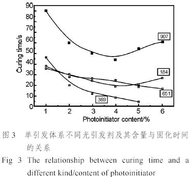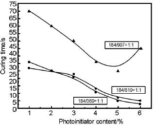 引發(fā)劑含量的變化對固化時間也有影響,Irgacure907 和Irgacure184 體系的固化時間隨引發(fā)劑
