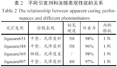 實驗對Irgacure651、Irgacure184、Irgacure369 及Irgacure907 4 種光引發(fā)劑對涂膜表觀性能的影響也進行了研究,下表為不同引發(fā)劑和涂膜表觀性能的關系。