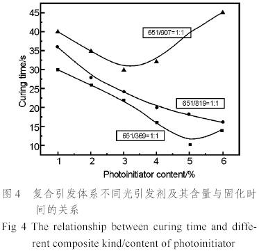 (2)對于復合引發(fā)體系,不同引發(fā)劑組成與含量的變化也影響固化時間。Irgacure651/ Irgacure907 、Irgacure651/ Irgacure369 和Irgacure184/ Irgacure907、Irgacure184/ Irgacure369 復合引發(fā)體系的固化時間介于組成該復合體系的單引發(fā)劑的固化時間之間。