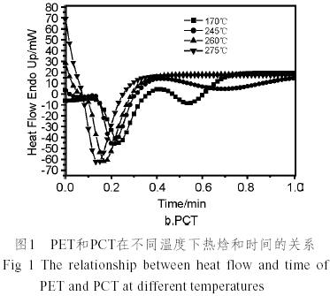 如圖1所示,將PET和PCT在不同溫度下的結晶熱焓和時間的關系進行比較,發現PET和PCT都隨著等溫結晶溫度降低,達到極小值的時間延長;另外,PCT的結晶過程比PET要復雜得多,在測試溫度范圍內,PET的結晶熱焓只有一個極小值,而PCT在較低的結晶溫度出現兩個極小值,溫度越低,這種現象越明顯,這說明PCT在較低的結晶溫度下存在快速的二次結