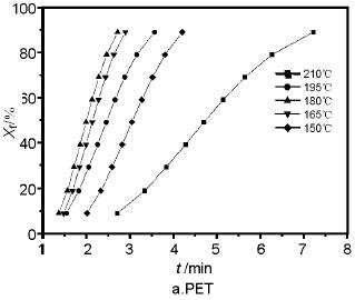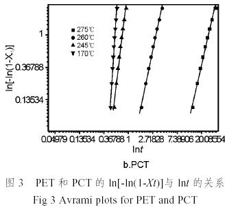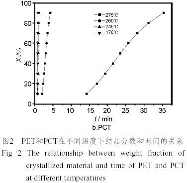 圖2是樣品在不同等溫結晶溫度下結晶重量分數與時間的關系,表明PCT的結晶過程與PET相差很大。從圖2可以看出,PCT在較高的溫度如275℃下結晶緩慢,隨著結晶溫度降低,結晶速度加快,直到在實驗過程中,由于PCT樣品在230℃和215℃的溫度下結晶速度太快而無法測定,因此可以斷定結晶速度最快的溫度應該在215~230℃左右,而不是圖示的170℃。