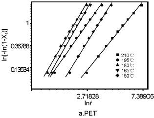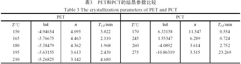 高聚物在等溫結晶過程中,其結晶速度也有變化。在剛開始時結晶速度很慢,這個時期成為結晶誘導期ti,然后結晶速度加快,達到極大值后又逐漸減慢,tc即為總結晶時間。從表2可見,對PCT來說,在275℃的溫度下,由于溫度太高,誘導時間ti和tc很長,分別達到了5.685min和41.225min,隨著溫度降低,結晶誘導期縮短,總結晶時間縮短,在210℃和215℃由于結晶速度太快而無法實驗,因此采用170℃的結晶溫度,結晶誘導期只有0.419min,總結晶時間也只有0.331min。而對PET,結晶溫度范圍內,ti和tc都隨結晶溫度升高而減少,到195℃達到極小值,而后隨結晶溫度升高而增大??梢酝茢?,在適宜的結晶溫度下,PCT所需的結晶誘導時間和總結晶時間比PET短,說明PCT比PET更容易結晶。