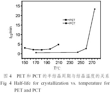 由圖4由可知,PET和PCT的半結晶周期與溫度的關系曲線呈下凹形,這是其晶核生長速度和晶粒生長速度存在不同溫度依賴性的共同作用結果。成核過程的溫度依賴性與成核方式有關,異相成核可以在較高溫度下發生,而均相成核宜于在稍低的溫度下發生。因為溫度過高,分子的熱運動過于劇烈,晶核不易形成,已形成的晶核也不穩定,易被分子熱運動所破壞。在270℃以下,PCT的結晶半周期均小于PET,說明在此范圍的溫度下,PCT比PET結晶快。由表3可以看到,PET在180℃左右半結晶周期最小,為1.968min,即結晶速率升至最高,而PCT應該在215~230℃左右結晶速率最高,最小結晶半周期小于170℃下的0.554min。表明PCT比PET的結晶速率更高,結晶能力更強。高分子的結晶能力有大有小,有些高分子容易結晶,或者結晶的傾向大;另一些高分子則不容易結晶或結晶傾向??;還有些完全沒有結晶能力。這種能力的差別的根本原因是不同高分子具有不同的結構特征,這些結構特征中能不能和容易不容易規整排列形成高度有序的晶格是關鍵[12]。