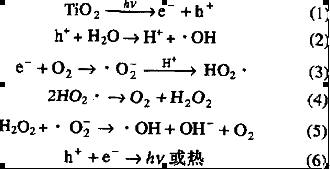 光觸媒反應(yīng)是岡紫外線能量激發(fā)二氧化鈦而引起的,故被稱為光固體介面反應(yīng)。納米Ti02為n一型半導(dǎo)體.從理論上講,只要半導(dǎo)體吸收的光能(hv)不小于其禁帶寬度,價(jià)帶上的電子(e)就可以被激發(fā)躍遷到導(dǎo)帶,在價(jià)帶上產(chǎn)生相應(yīng)的空穴(h+),隨后h+和e-與吸附在TiO2表面上的H2O,02等發(fā)生作用,生成·0H,·02-等高活性基團(tuán),當(dāng)然,產(chǎn)生的空穴和電子還有復(fù)合的可能.二氧化鈦受光激發(fā)后內(nèi)部生成電子與空穴,擴(kuò)散到表面的電子和空穴能參與光觸媒反應(yīng),并能制造氧化能力極強(qiáng)的氫氧自由基,使光觸媒一~Ti02具有抑菌、殺菌、脫消臭、無毒性、親水性、自潔性等特性,因此,光觸媒成為理想的環(huán)保產(chǎn)品之一。其光催化反應(yīng)機(jī)理如下[2]: