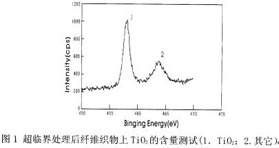 據(jù)資料介紹,利用超臨界二氧化碳流體制備納米TiO2已獲得成功,借助超臨界流體的性質(zhì),可使氣液界面消失,孔內(nèi)界面張力不復(fù)存在,從而獲得比表面積增大的效果。采用超臨界流體制備納米材料所得的樣品具有熱穩(wěn)定性好、比表面積大、平均粒徑小且分布均勻等優(yōu)點(diǎn).此外,該方法還可方便地通過調(diào)節(jié)超臨界流體的壓力和溫度來調(diào)節(jié)其密度進(jìn)而調(diào)節(jié)其溶解性能,最終達(dá)到控制納米材料性能之目的[5,6]。由于超臨界二氧化碳流體對高分子材料有快速膨脹作用[7],可借助對流體壓力、溫度、時(shí)間的控制與調(diào)節(jié)來獲得所需的效果。進(jìn)一步的研究認(rèn)為:超臨界二氧化碳溶液對含氟表面活性劑具有較大的溶解度,尤其適用于作超臨界二氧化碳萃取的絡(luò)合劑[6]。本研究選用氯化鈣一磷酸體系作為基質(zhì)一纖維織物的表面修飾劑,再借助超臨界流體對含氟表面活性劑形成的反相乳液的溶解能力,使含Ti02反相乳液能夠均勻的分布在纖維織物表面,通過對超臨界流體溫度、壓力的調(diào)整控制,最終使Ti02附著在經(jīng)修飾形成的孔道及其纖維織物的表面。圖1為采用XPS對經(jīng)超臨界C02處理后的纖維織物上TiO2,含量的定性測試結(jié)果:
